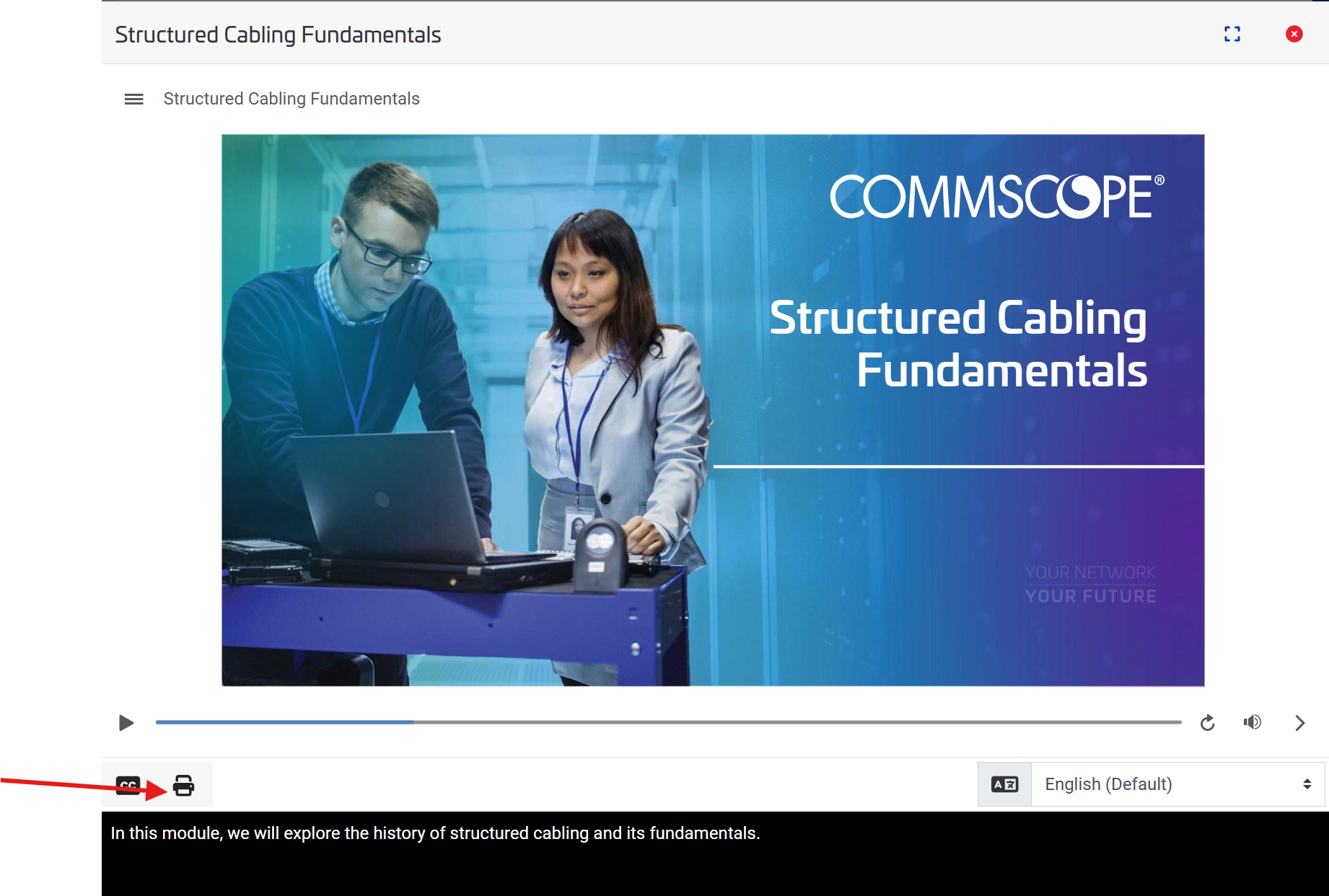 To find the print option click on your course in your account, click on the webcast, press play and at the bottom left you will see the printer icon, see image below